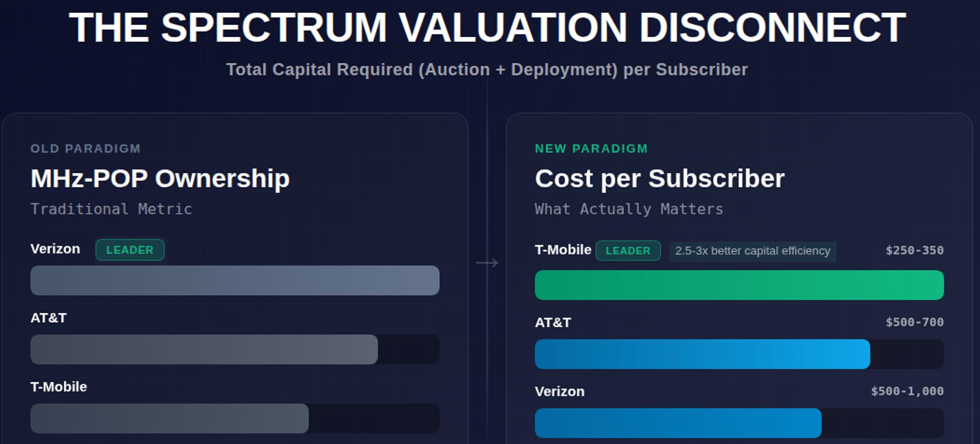 • T-Mobile: Est. $250-350 per subscriber (leveraging 2.5 GHz efficiency)