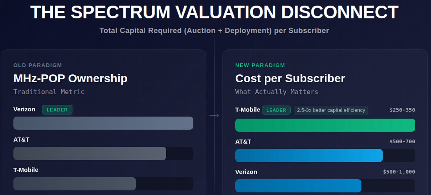 Combined with inherited Sprint metro fiber assets, their estimated deployment cost per incremental site is substantially lower—giving them a 60% cost advantage per site despite holding ~50% less aggregate MHz-POP than Verizon.